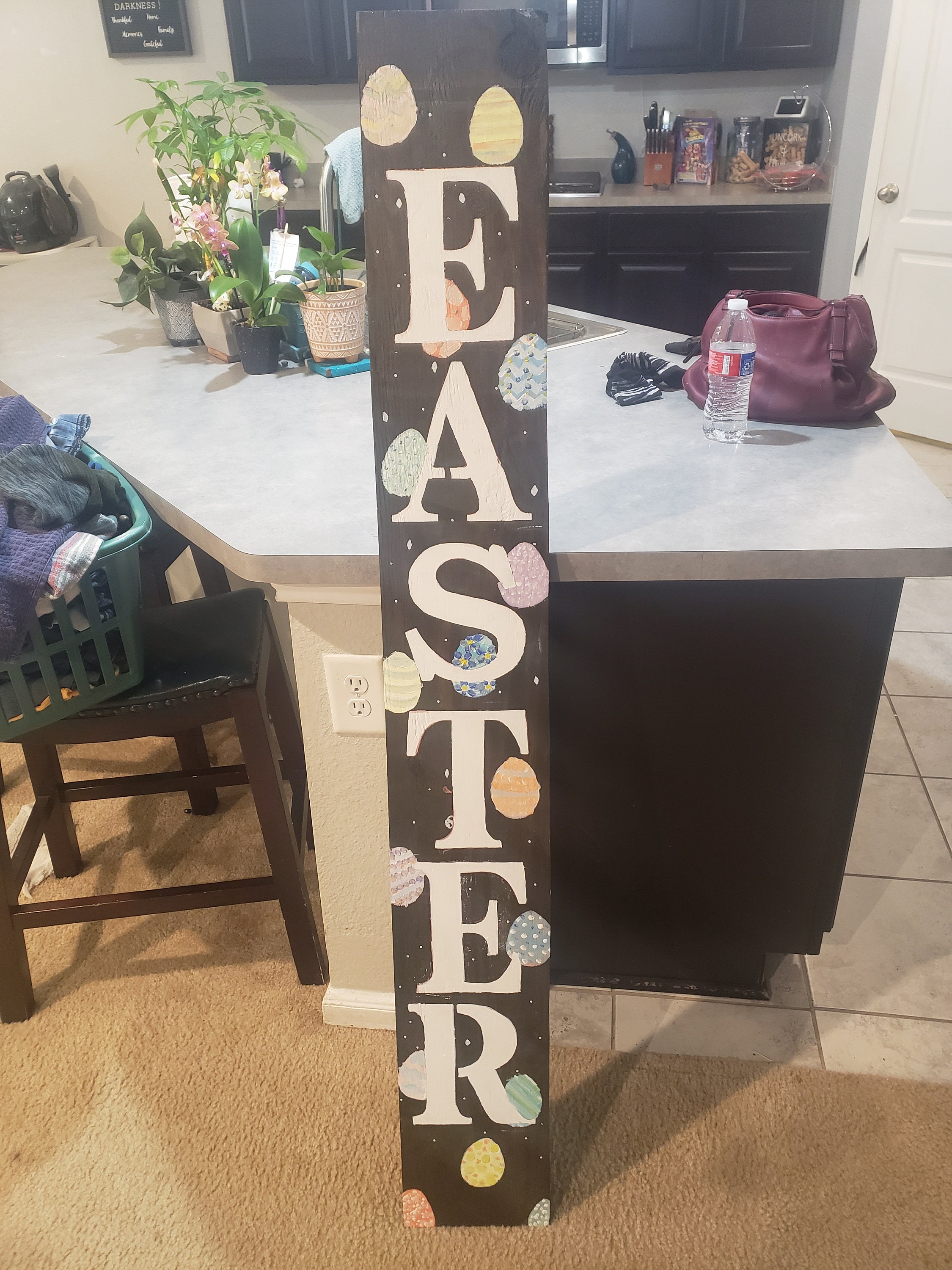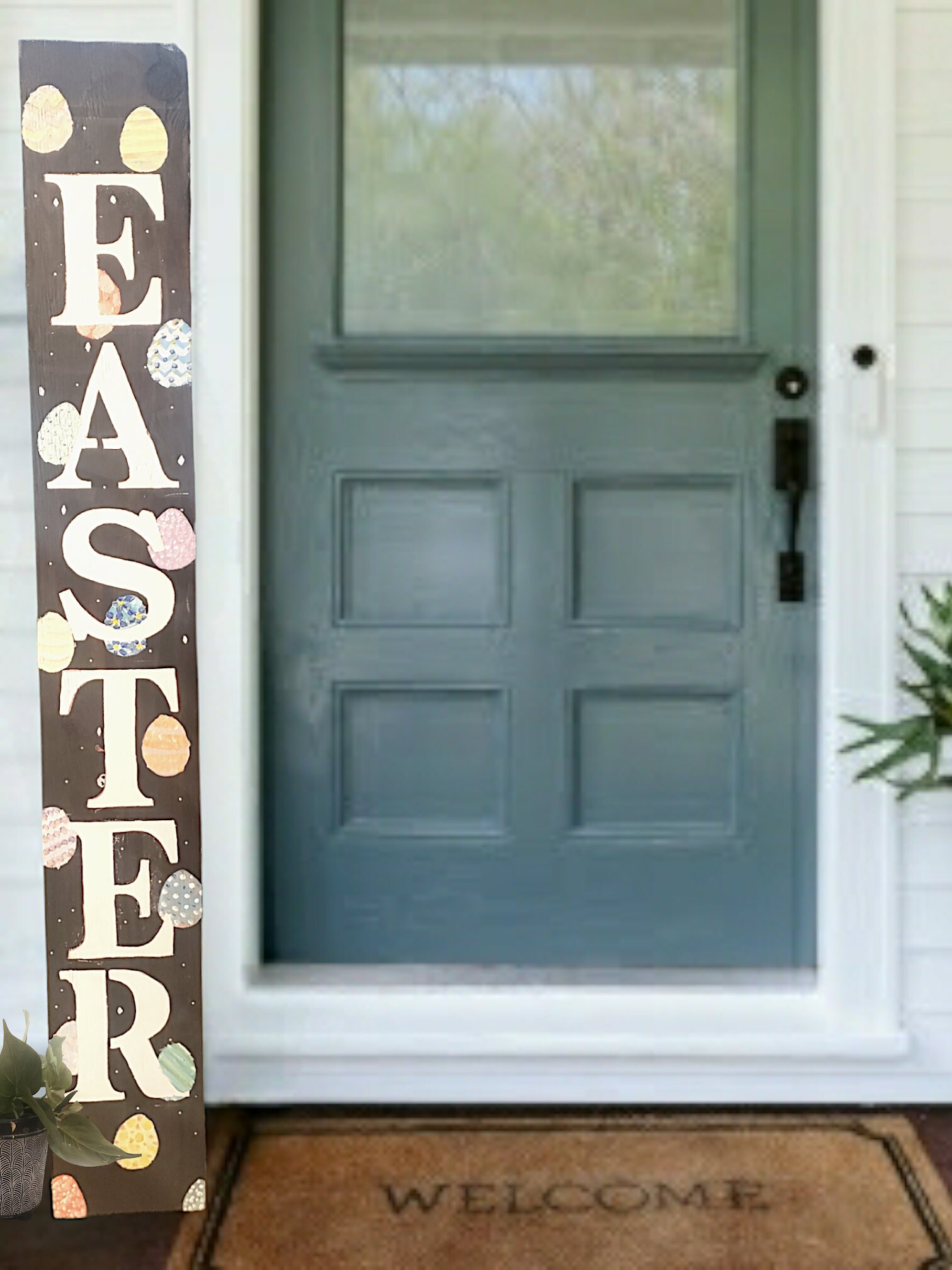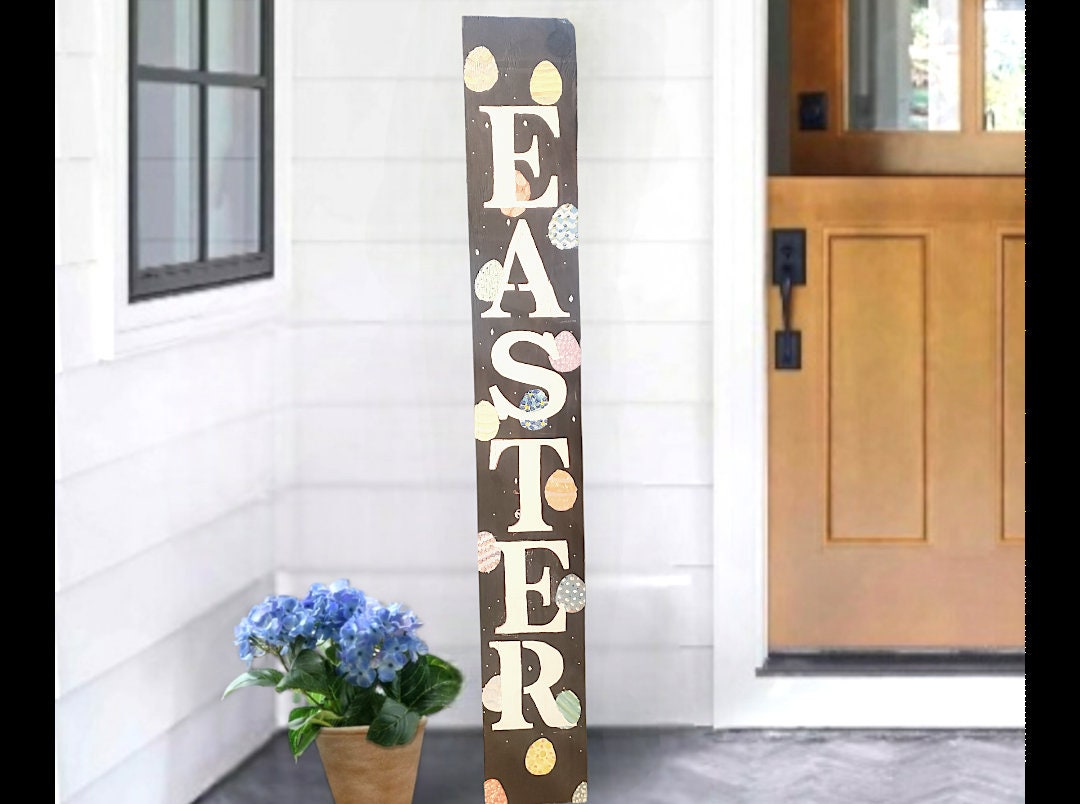 This Easter Porch Leaner Sign with Colorful Easter Eggs on Dark Walnut is the perfect addition to any porch or entryway sign to welcome Easter guests.