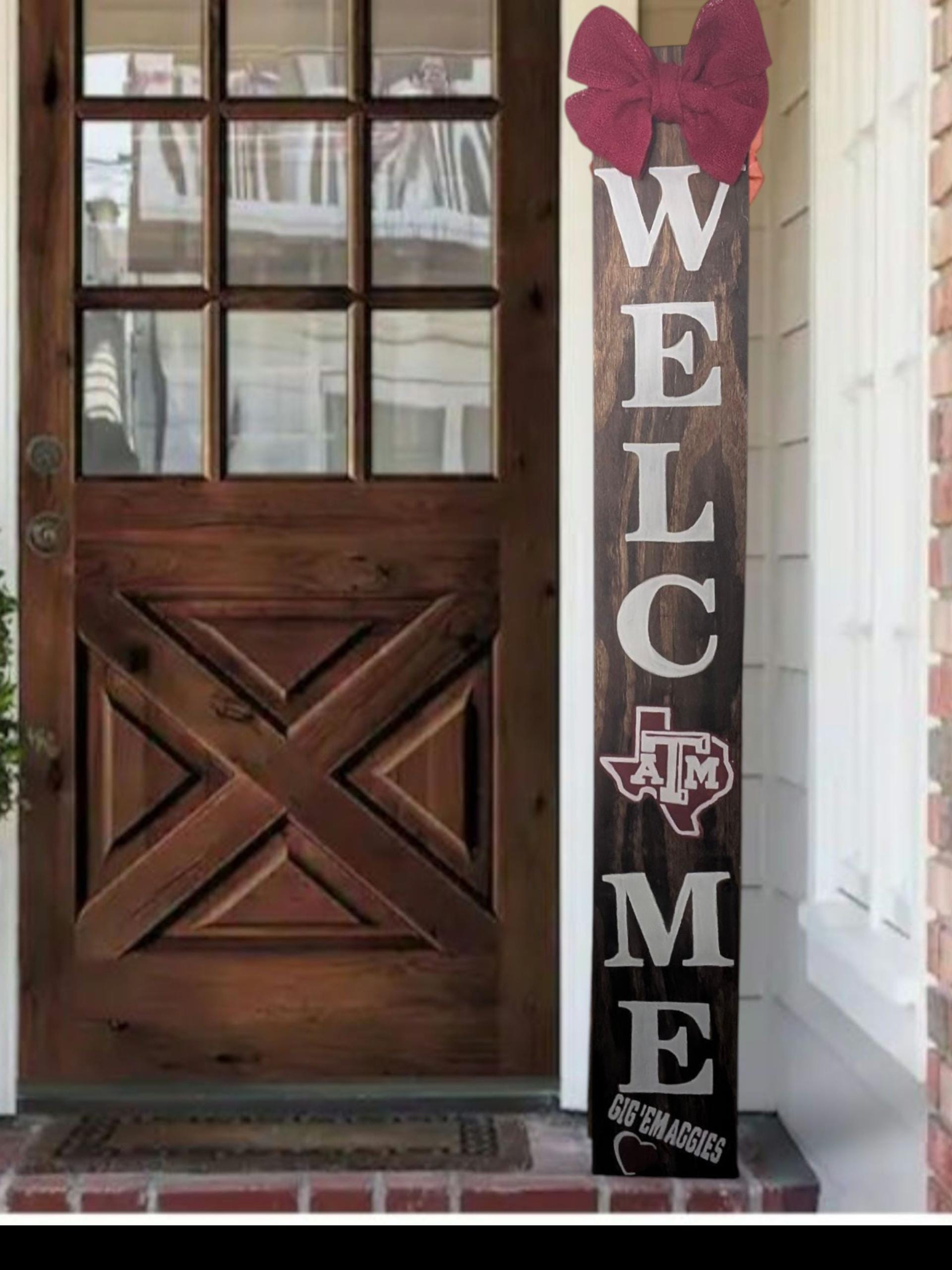 Texas A&M Welcome Wooden Porch Leaner SIGN with Maroon Emblem and Maroon Burlap Bow ( shown on Red Oak) is the perfect addition to any porch or to give as a housewarming present.