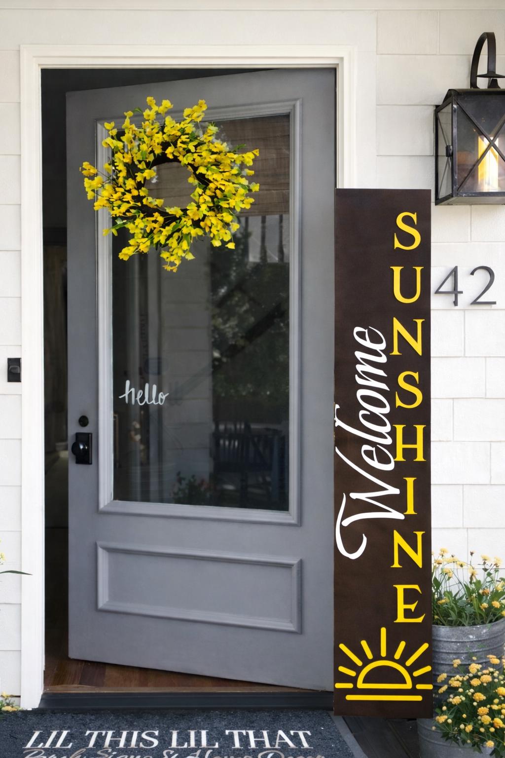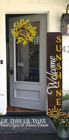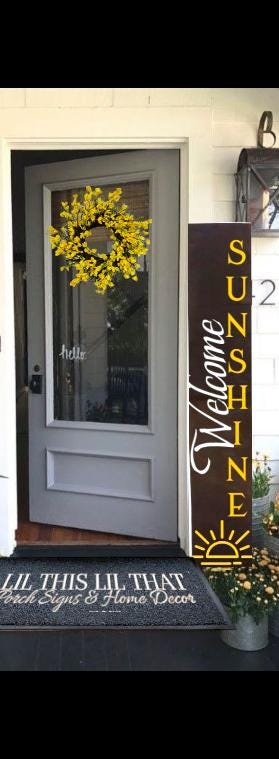 This Beautiful Porch sign is the perfect addition to any Porch to welcome guests and family . IT also makes the perfect housewarming gift and make the best impressions. The saying Welcome Sunshine is beautifully handpainted down length of sign. Sunshine is painted in bright yellow.
