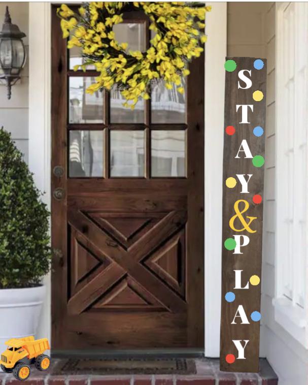 This hand-painted wooden Stay&play porch leaner sign with colorful polka dots is the perfect addition to any porch or entrance to add a playful and colorful touch .