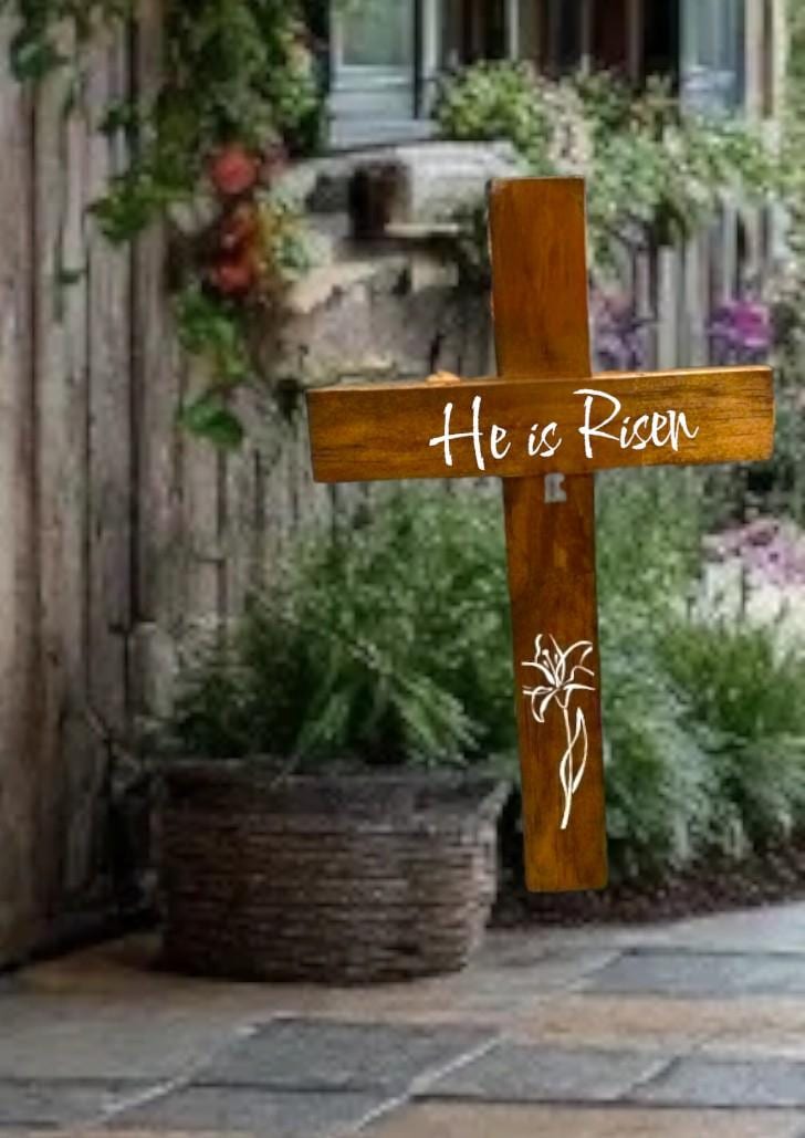This he is risen. Wooden cross is the perfect addition to any Easter decorations to celebrate the resurrection of Jesus Christ. The the cross is hand cut, stained in color of choice, and then sealed to protect against the elements including UV and rain. Making this sign perfect for indoor and outdoor displays alike.