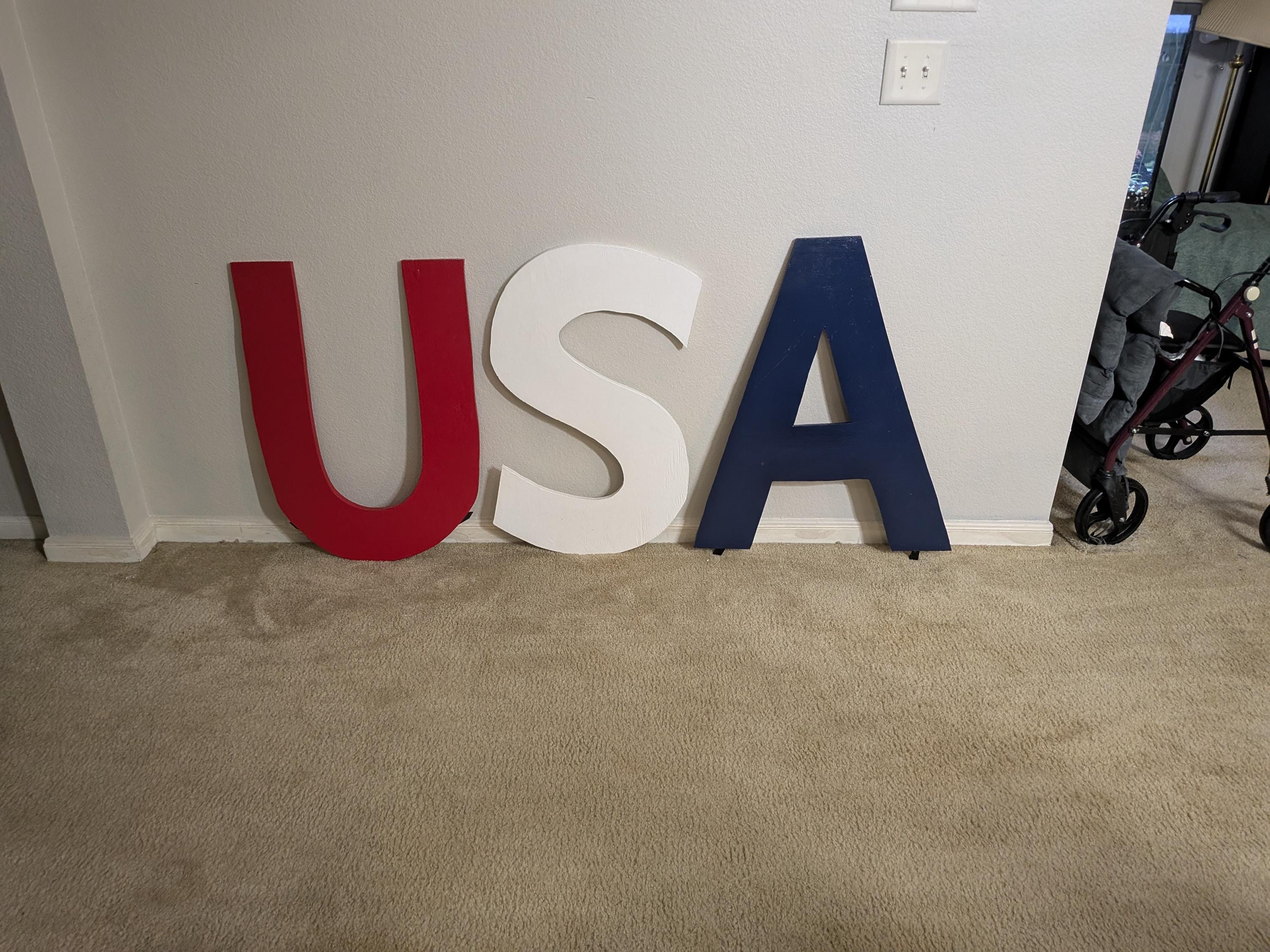 This USA cutout is the perfect addition to any patriotic Decor. It is Handpainted , sealed, and coated . It will last many holidays.