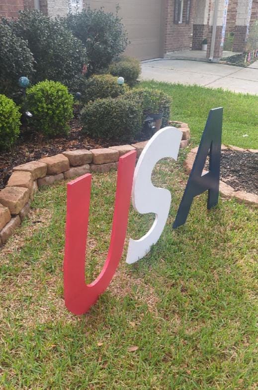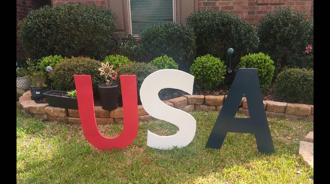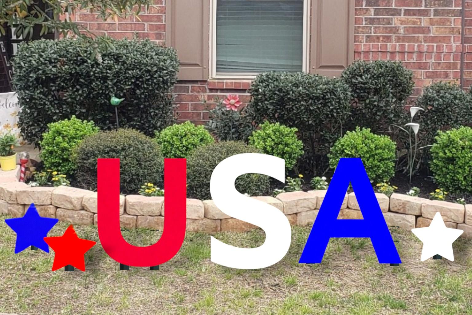 Add bold patriotic charm to your yard with this handmade USA and Star yard display!