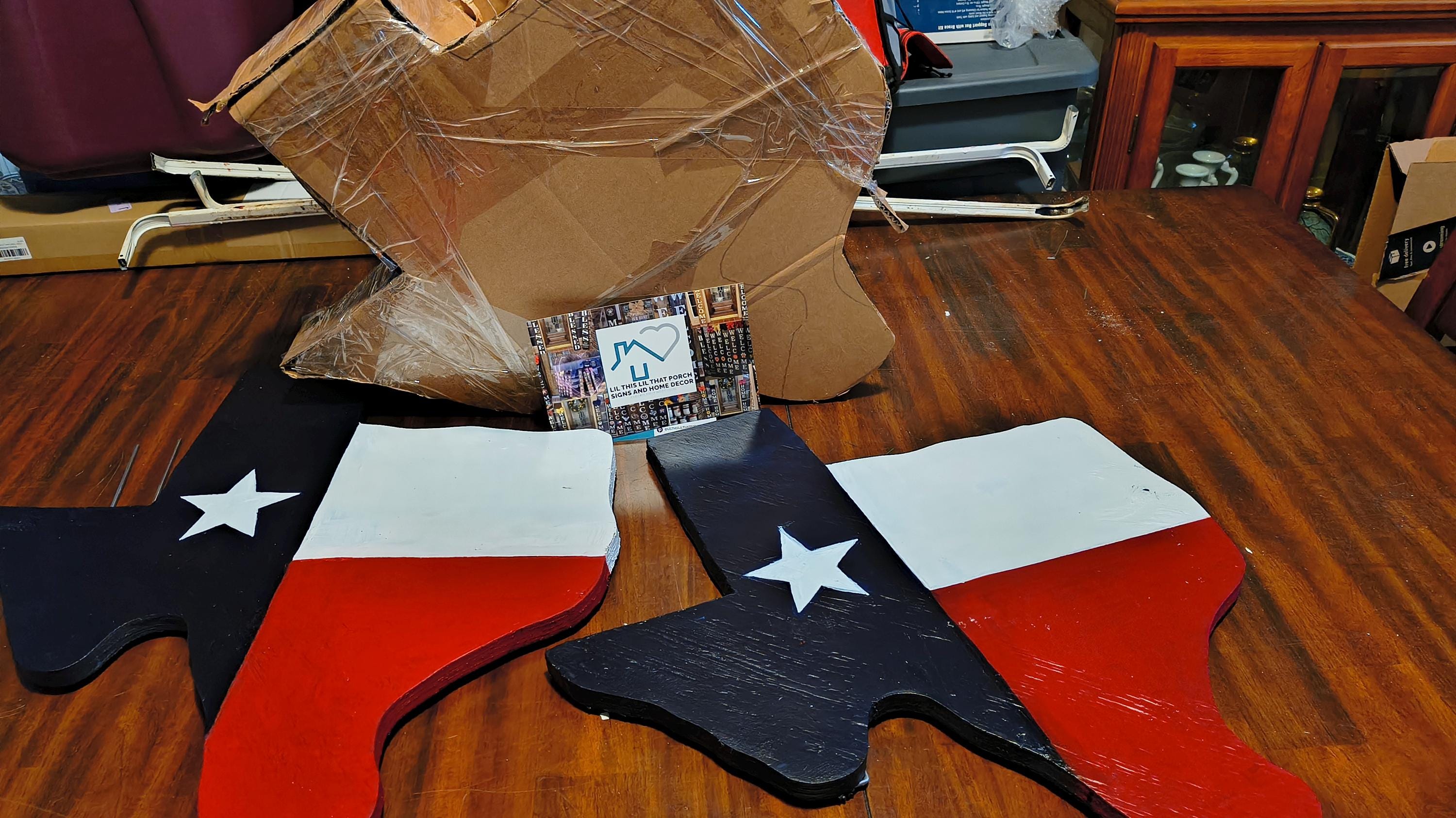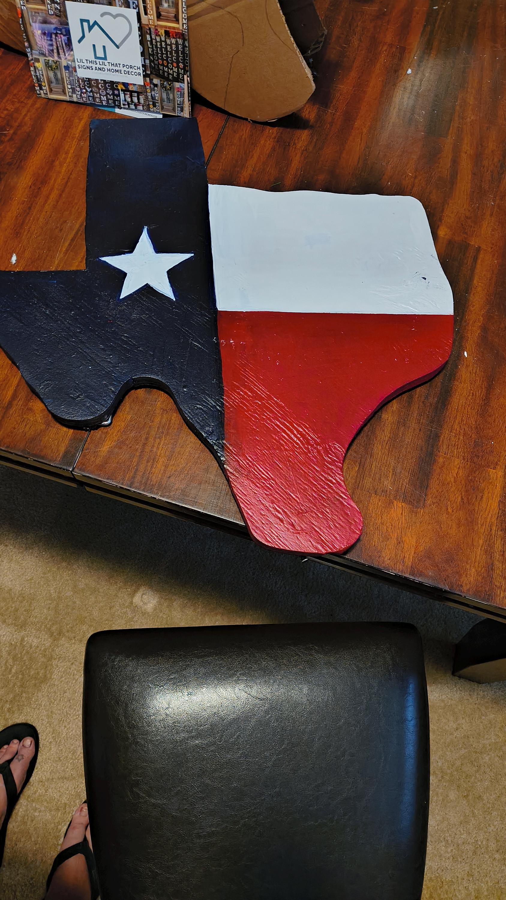 This Texas Size Texas shaped Texas flag Wooden Yard Cutout Yard art is the perfect addition to any yard or landscaping decor. It stands 22 inches tall and is 23 inches wide without stake . It is 1 inch thick and heavy in weight. With stake it is 28 inches to 30 inches tall. Stake is included.