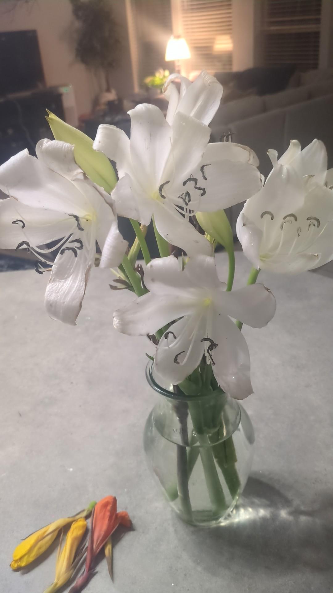 Pictured above is the first blooms of the season. made by only 2 bulbs. There are 5 Blooms per stalk. White with black pollen. Spectacularly fragrant, Crinum Powellii Album is a striking perennial featuring umbels of large, trumpet-shaped, snow-white flowers.