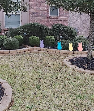 Add a sweet pop of spring color to your lawn with this adorable set of 4 Easter Peeps yard art pieces. Each bunny silhouette stands approximately 14 inches tall and is designed to bring cheerful Easter vibes to flower beds, walkways, and front yards.